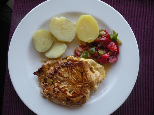Peito de Frango recheado com curgete e cenoura, acompanhado de batata cozida e uns legumes.